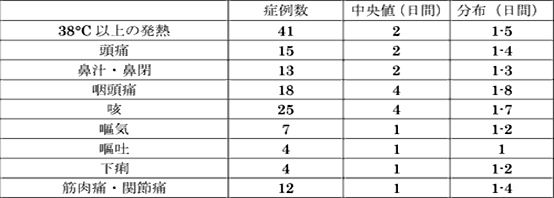 小学生の集団発生は現時点では日本国内ではまだ少ないです。咳、咽頭痛、熱感・悪寒は全員が経験していました。全身倦怠感は80%、頭痛80%、咽頭痛、鼻汁・鼻閉、関節痛はそれぞれ60%に認められました。下痢、腹痛、嘔吐等の消化器症状は認められませんでした。調査対象者数は5名と少ないものの、重篤な状態となった患者はなく、診断・治療後には比較的速やかに解熱していました。また、2名は急性呼吸器症状が数日間先行した後に38℃以上の高熱を呈しました。